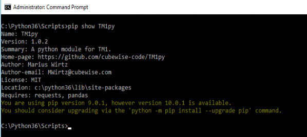 It is going to show you information about TM1py and the version number, in this example v1.0.2: