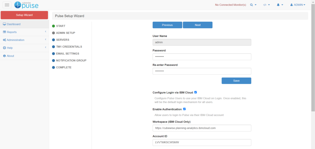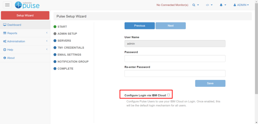 Step 11: Refreshing the page (F5) will remove the Setup Wizard button from the menu. Setup Wizard button should have disappeared. Even though IBM ID was configured in step 4, you will still be using the default Pulse Admin user: