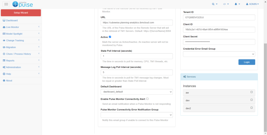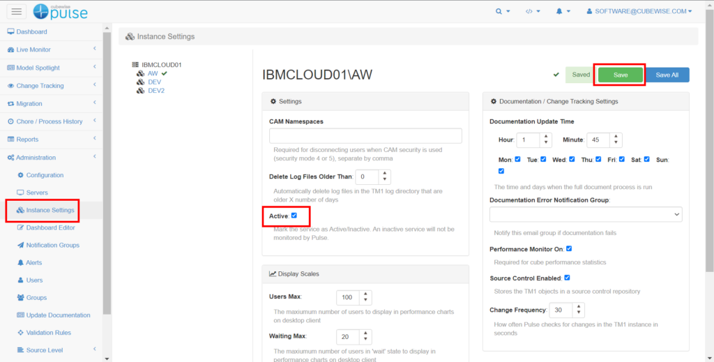 Step 11: Go to Instance settings and set the Active flag for each TM1 instance which needs to be monitored by Pulse. By default all TM1 instances are not monitored by Pulse. Just tick the Active flag and then click the Save button: