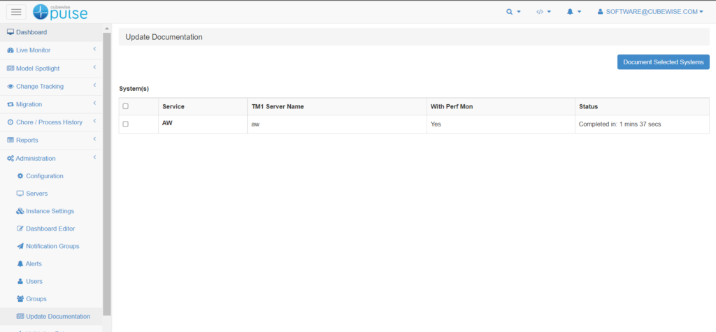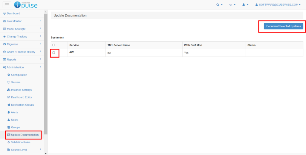 Step 12: The documentation needs to be executed for each active TM1 instance. Go to the Update Documentation page under Administration, select the instance and click the Document Selected Systems.