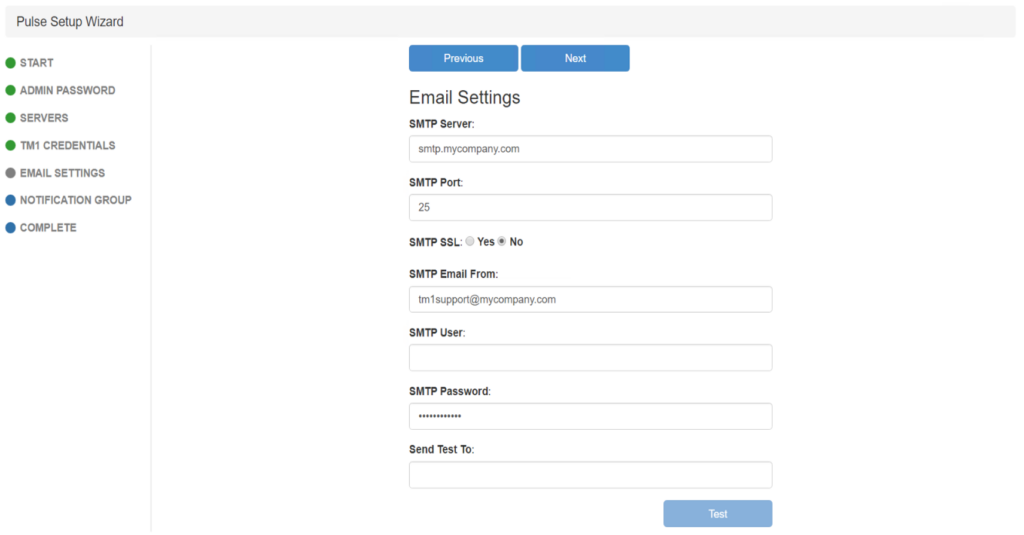 Step 8: SMTP Settings: Pulse requires access to your corporate SMTP server to send email alerts. On most corporate networks you only need to provide the SMTP server (or IP address) and a Email From address.