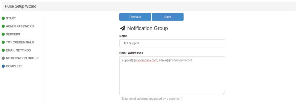 Step 9: Notification Group: Pulse can have one or more Notification Groups, these are assigned to Alerts and allow you to send emails to a group of people. Before finishing the wizard you need to add have at least one notification group. Multiple email addresses should be separated by a comma.