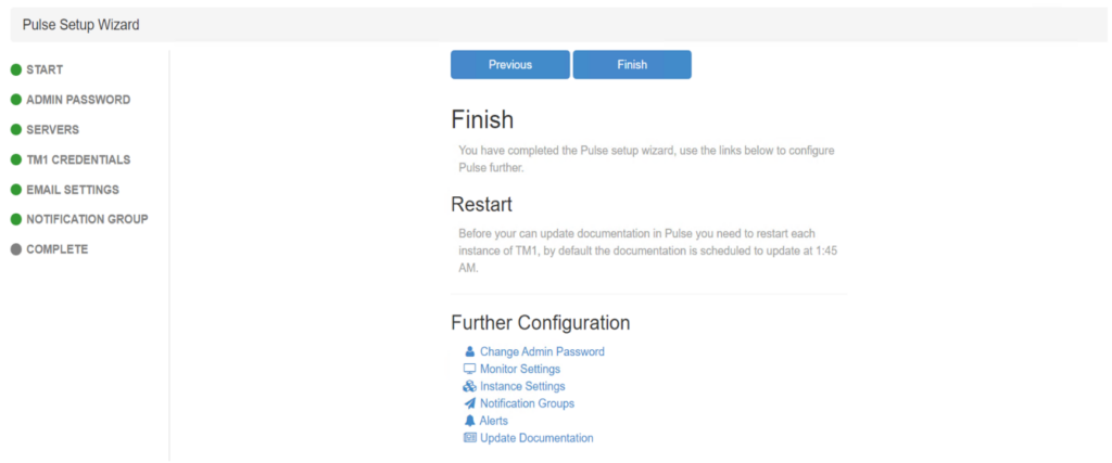 Step 9: Notification Group: Pulse can have one or more Notification Groups, these are assigned to Alerts and allow you to send emails to a group of people. Before finishing the wizard you need to add have at least one notification group. Multiple email addresses should be separated by a comma.