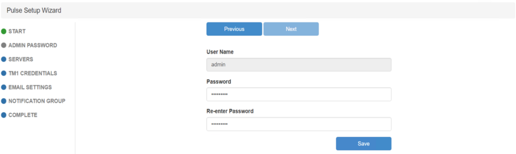 Step 4: Change the Admin password: Change the default Pulse admin user password, the password must be a strong password as shown in the message below. Click Save and Next.