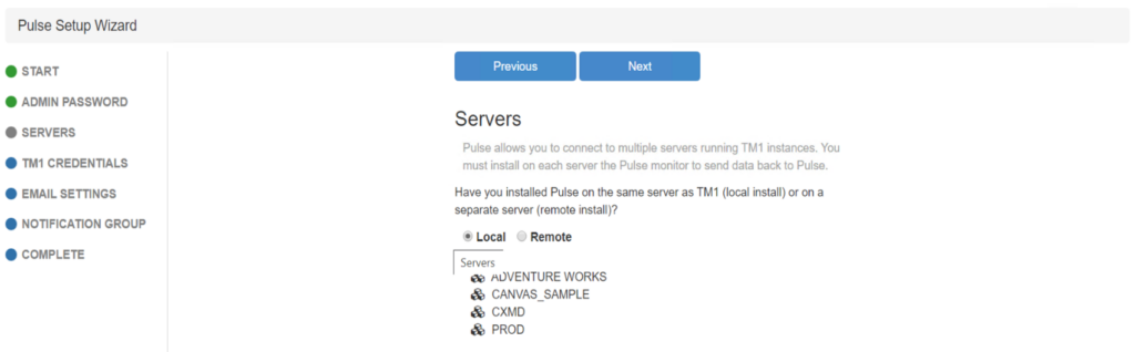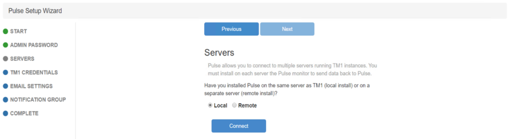 Step 5: Connect to a Pulse server: If Pulse is installed on a TM1 server, you can tick Local and then Connect (To connect to a Remote Pulse Monitor check the Connecting Pulse Monitor section).