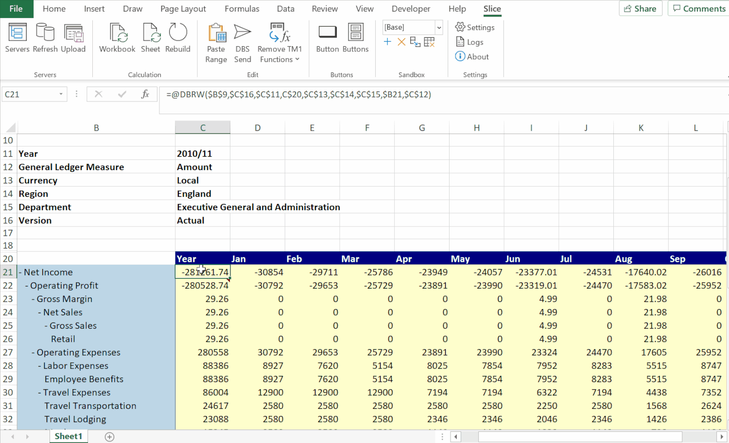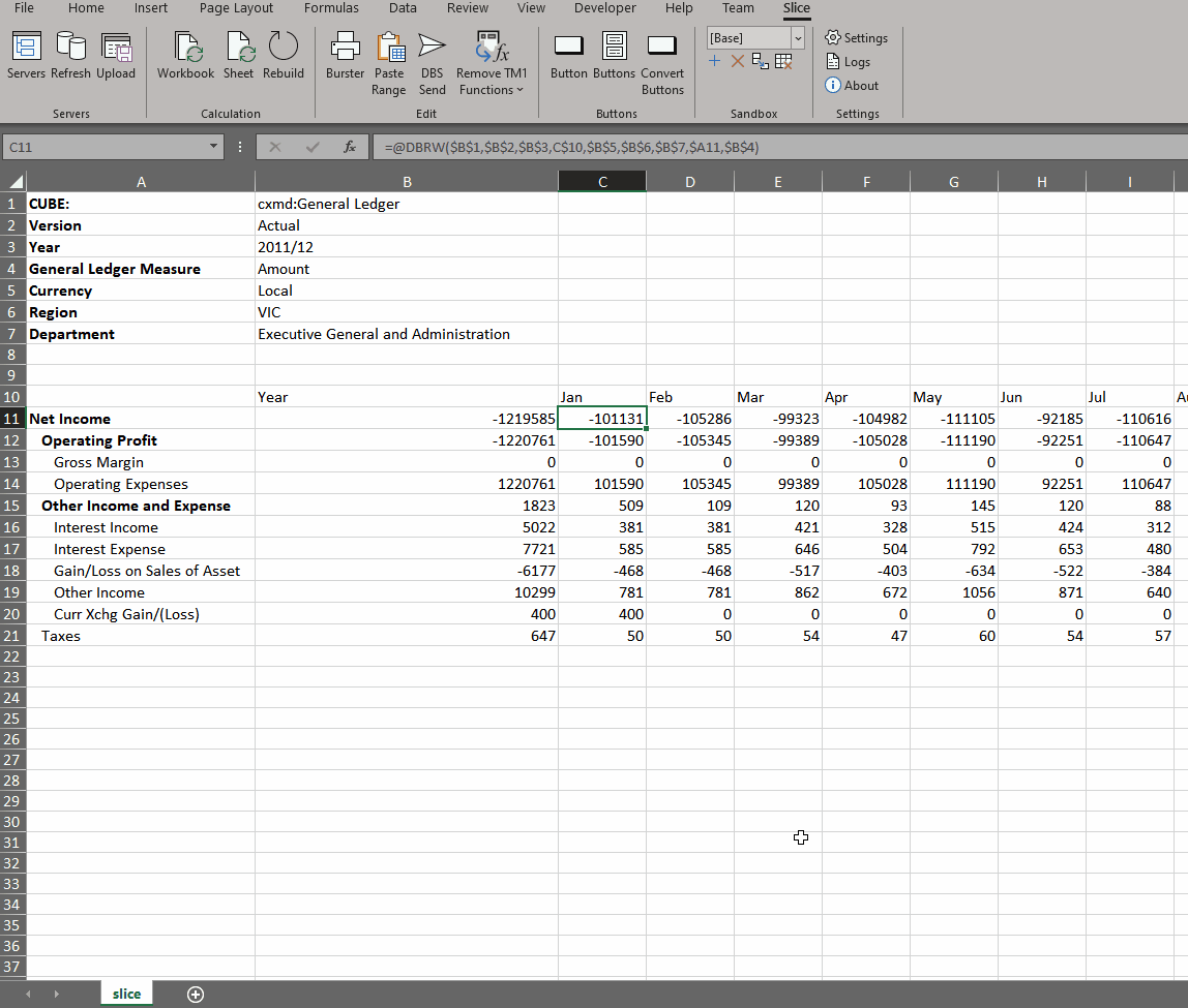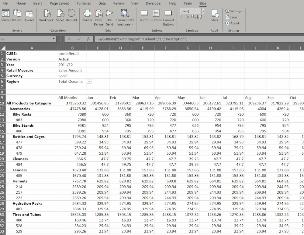 Slice integrates seamlessly with Excel in a TM1 Perspectives like style, allowing you to create dynamic interactive reports. For example, a finance manager can pull real-time financial data from TM1 into Excel to generate customized reports that automatically update with the latest figures, such as revenue, expenses, and profit margins across departments. Features like dynamic columns and virtual consolidations enable users to adjust views and perform in-depth analyses, facilitating quick, data-driven decisions.