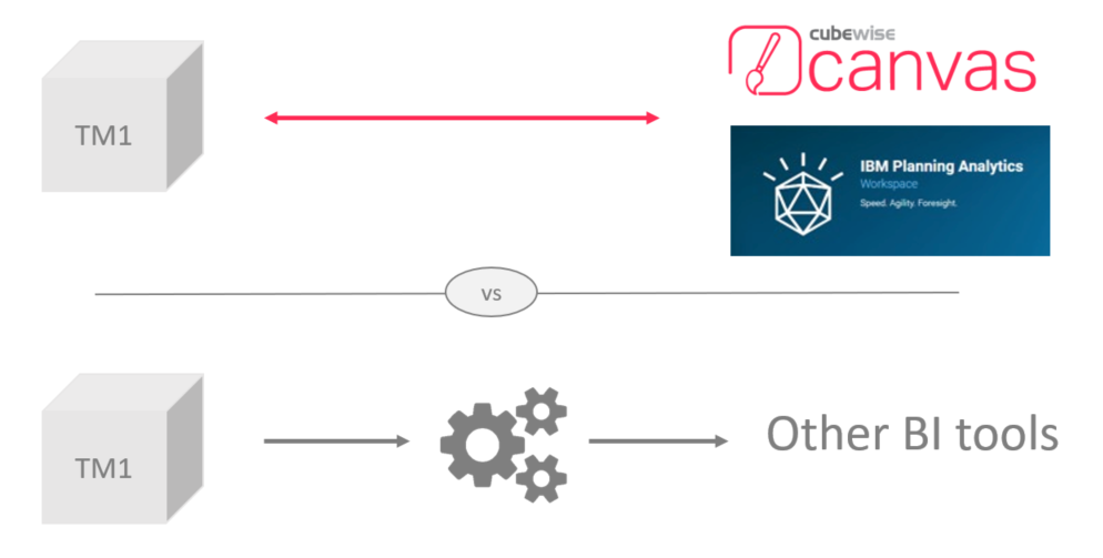 Canvas and Planning Analytics Workspace are both designed to build web applications natively on TM1 using the TM1 REST API. This means that both are very fast and require no other data layer (no “connector”, no flat file interface, etc.) to access TM1. They both are focused on TM1-specific functionality which means they feature the rich, high-performance write-back capabilities that underpin business planning applications.