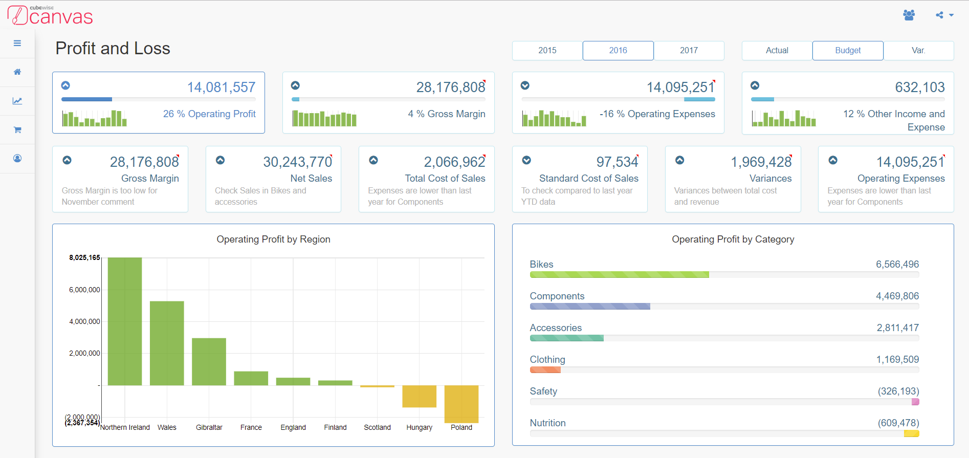 Canvas, on the other hand has adopted a cell-based approach to application building similar to Excel, and TM1 Perspectives. This means each cell in Canvas has its own DBR formula to retrieve data and to update TM1, which is exactly how TM1 Developers are used to working with TM1. So with Canvas, you can easily combine data from two different cubes into one table or chart as you can in Excel and TM1 Perspectives.