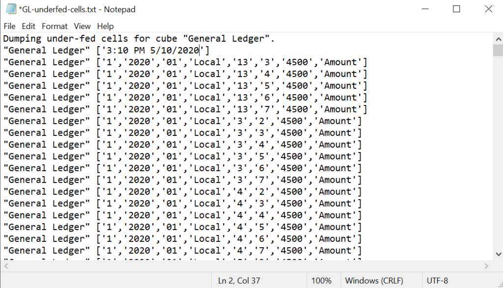 For example executing DebugUtility( 113, 0, 0, ‘General Ledger’ , ‘C:ArcGL-underfed-cells.txt’ , ” ); in a TM1 process will create a txt file with the list of all under-fed intersections for cube General Ledger: