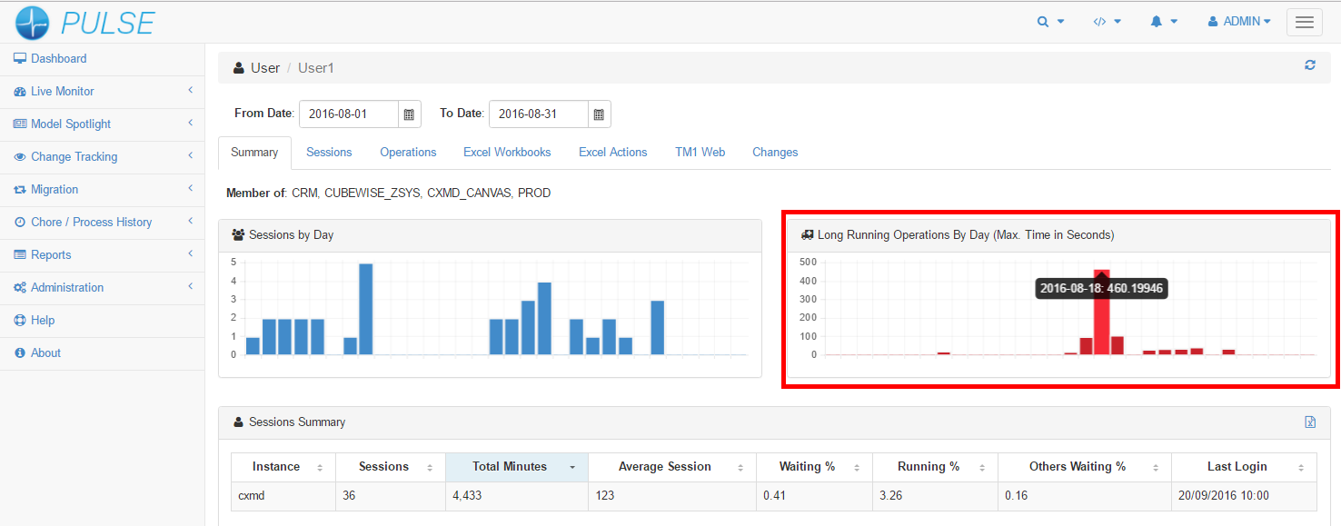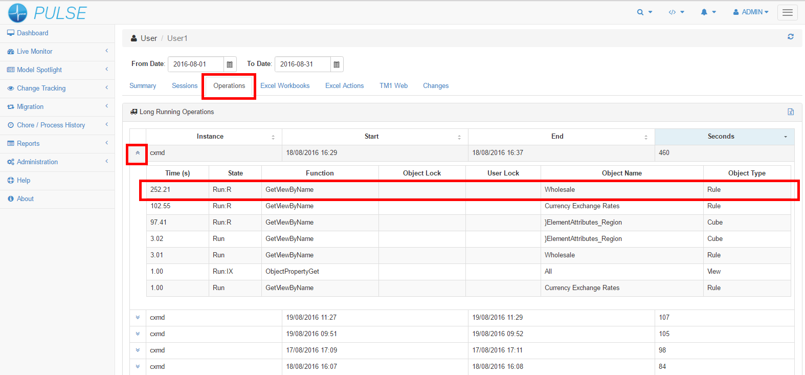 By default Pulse will consider as a long running operation everything (run TI, open cube view, spreadsheets…) which takes more than 10 sec. In the example above, we can see that one operation took 460 sec. So now let’s find out what is this operation.