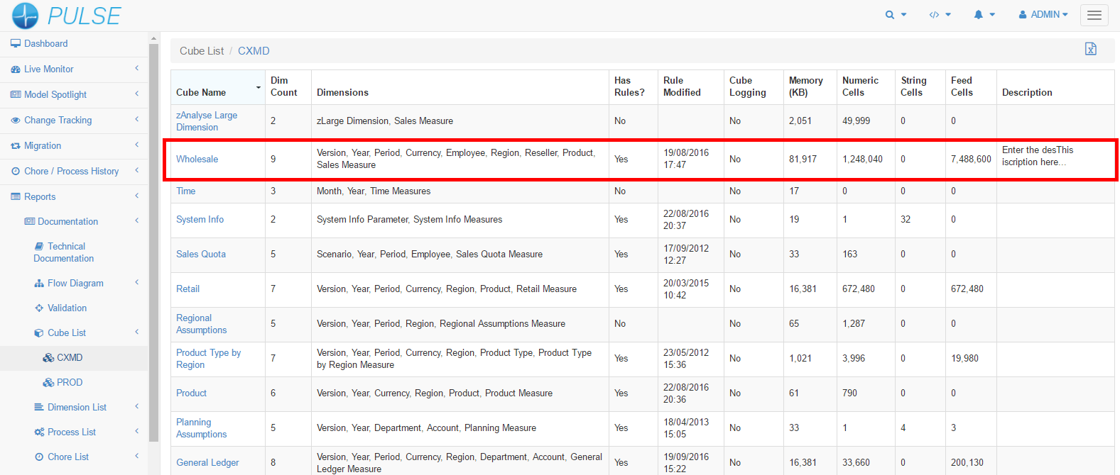 Clicking on the name of the cube (in this example: Wholesale) will display further details of the cube.: