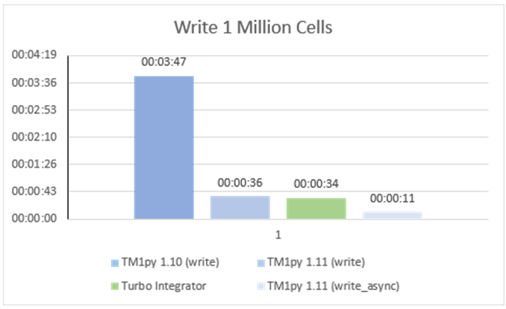 As you can see below the write_async function in v1.11 is now faster than single-threaded Turbo Integrator (11 vs 34 seconds):