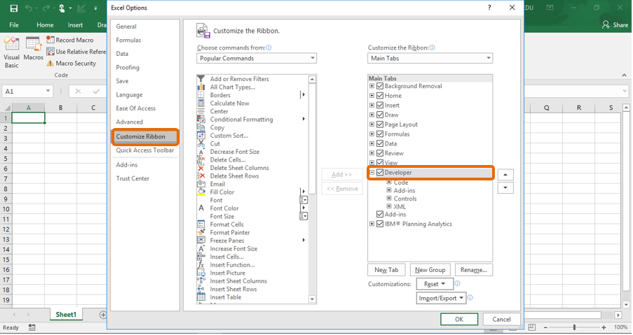 Customize Ribbon → turn on ‘Developer’ → OK