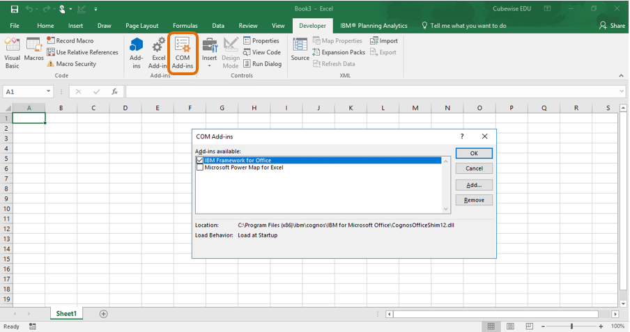 Go to the ‘Developer’ tab → select ‘COM Add-Ins’ → turn on ‘IBM Framework for Office’ → OK