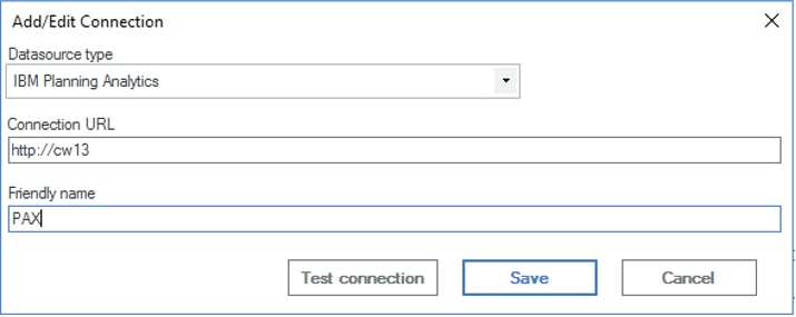 Choose the datasource type ‘IBM Planning Analytics’ → for the Connection URL, enter the details to the TM1 Server (http://:) → enter a friendly name for the connection → Click ‘Test connection’ → Click ‘Save’