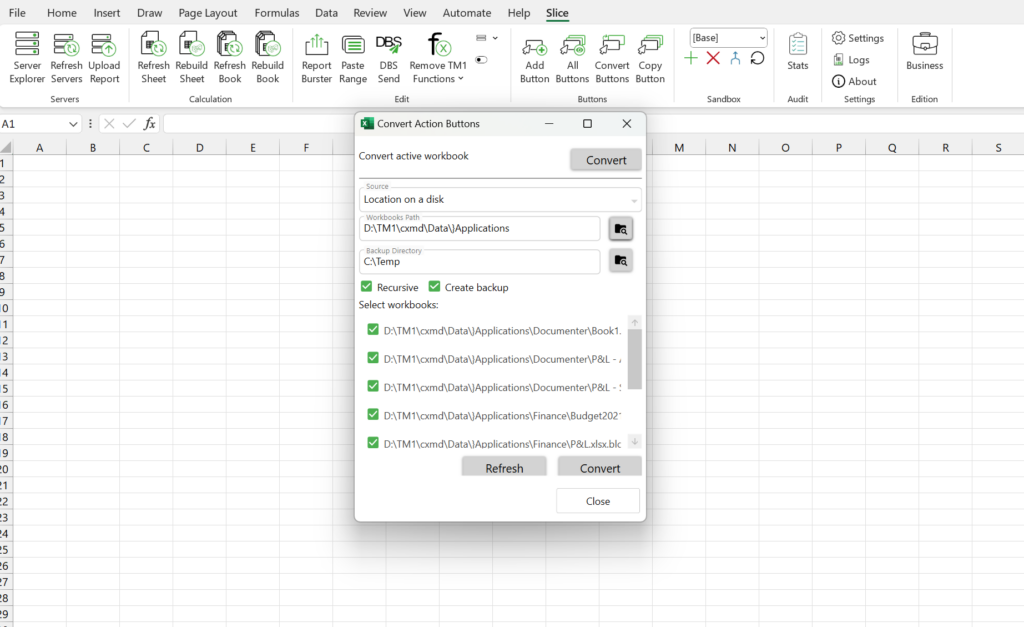 All Excel reports built with Perspectives will work in Slice. The only work that needs to be done is to convert the buttons, and Slice includes a feature to do it for you.