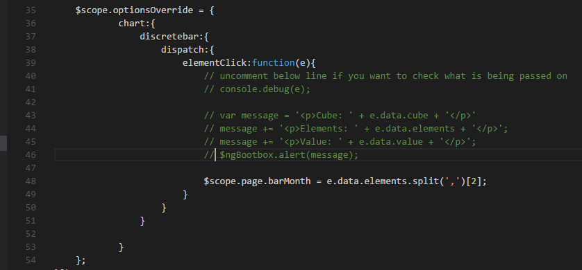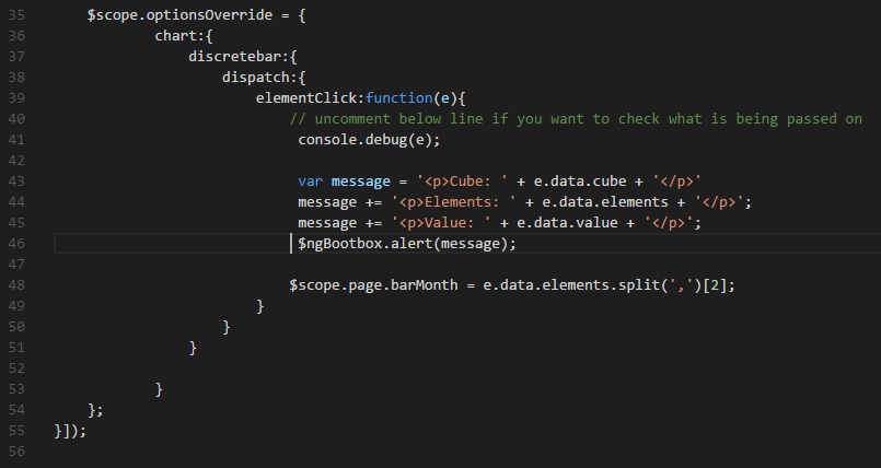 For our example, this is defined in the JavaScript file attached to the Visualisations sample: js/controllers/samples/componenets/sample-advance-chart.js.