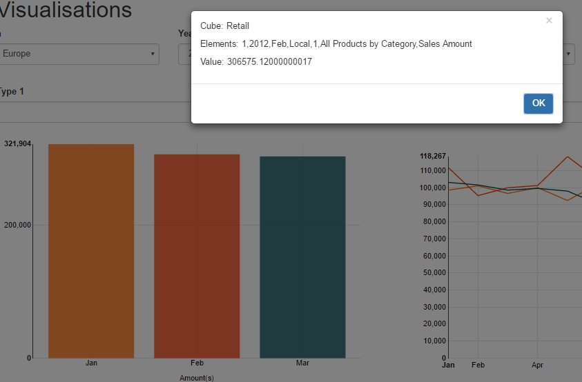 An example has been setup in the Visualisations sample page showcasing how you can modify the options, and, for this example, be able to grab the data attached to the bar element that was clicked on by the user on the front end. A table is then displayed corresponding to the month of the bar element: