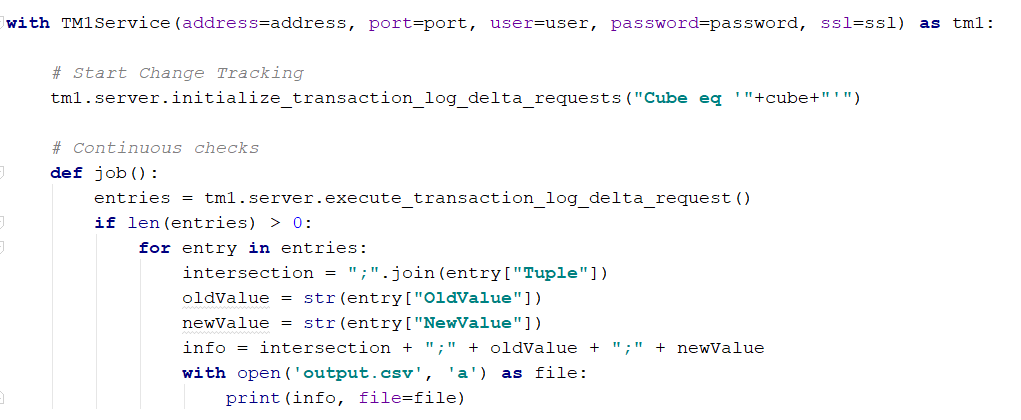 To run this sample, you just need to update at the top the TM1 configuration parameters (address, port…) and the cube you want to track: