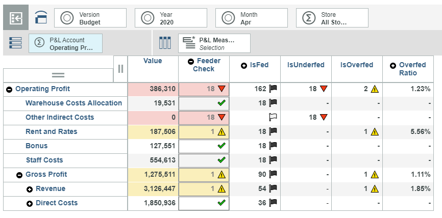 When calculated cells are not fed ️️, these will not be aggregated and therefore values at consolidated levels will be wrong. This is called underfeeding . Underfeeding issues can be spotted by users as it will result in the wrong values being shown at the consolidation levels.