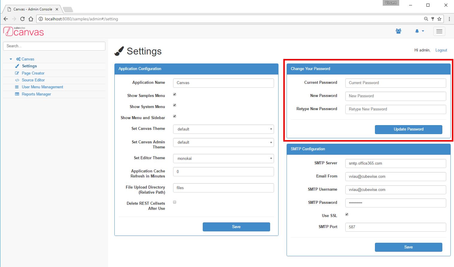 - http://<server name>:<Canvas port number>/<Application name>/admin#/setting
