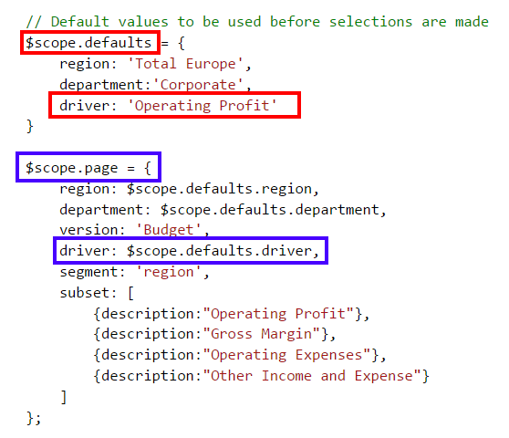 In the example below we have three defaults variables (defaults.region, defaults.department and defaults.driver) and 6 variables that we are going to use in our HTML page (page.region, page.departement, page.version, page.driver, page.segment and page.subset):