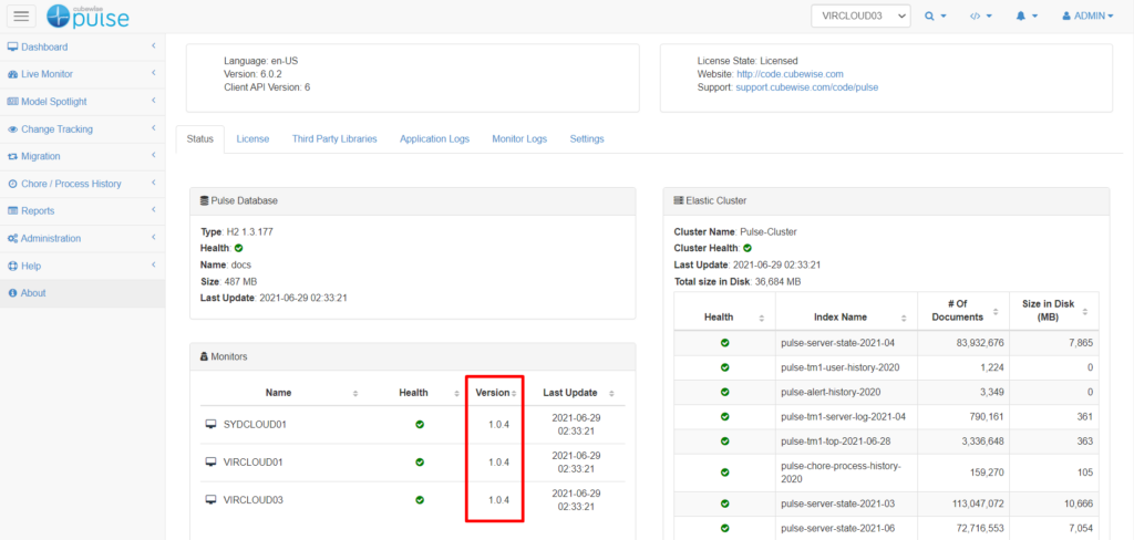 The Pulse Monitor version number can be found in the Status tab of the Pulse About page as below: