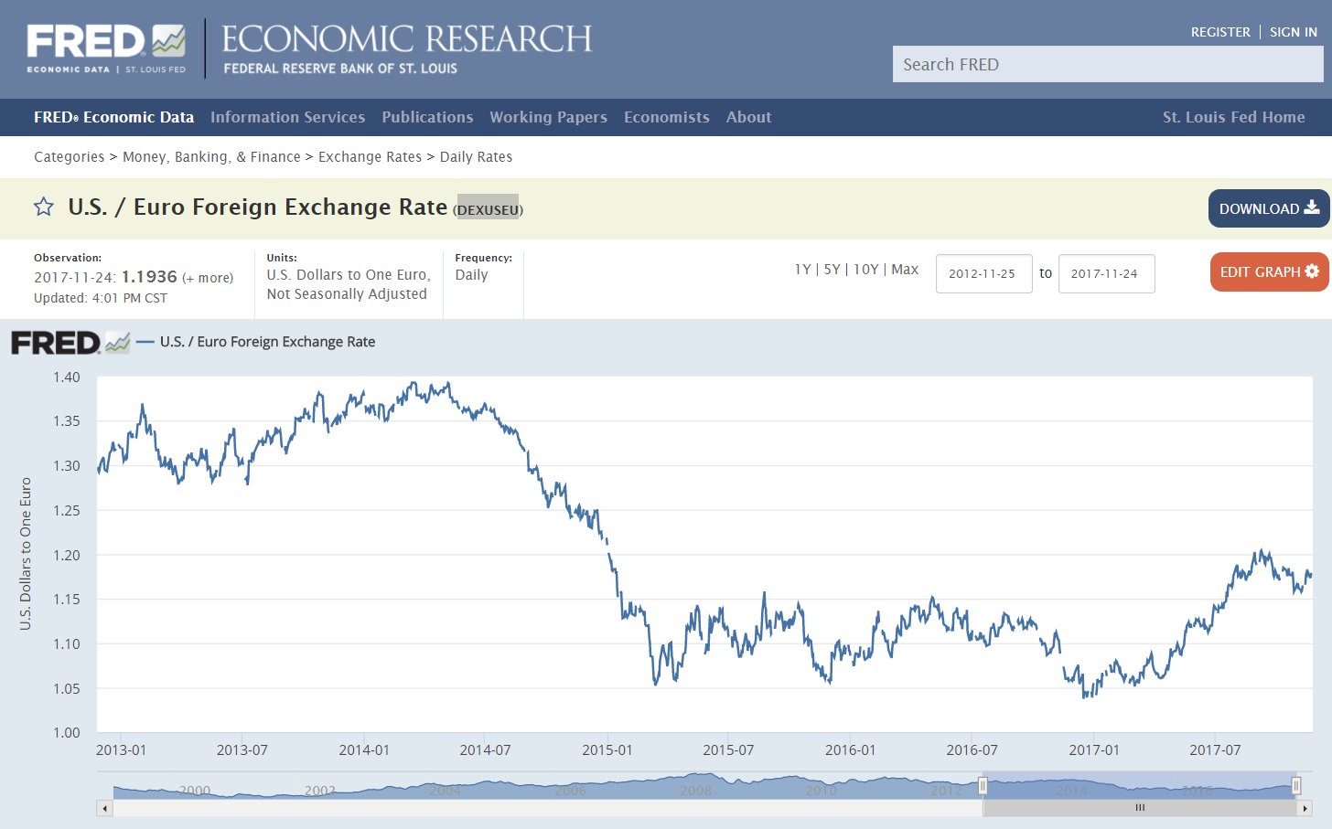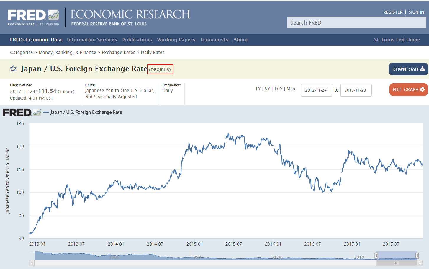 The Federal Reserve Bank of St.Louis is a financial institution which offers lots of financial data such as all exchange rates. In this example we are interested to the exchange rate from USD to JPY: