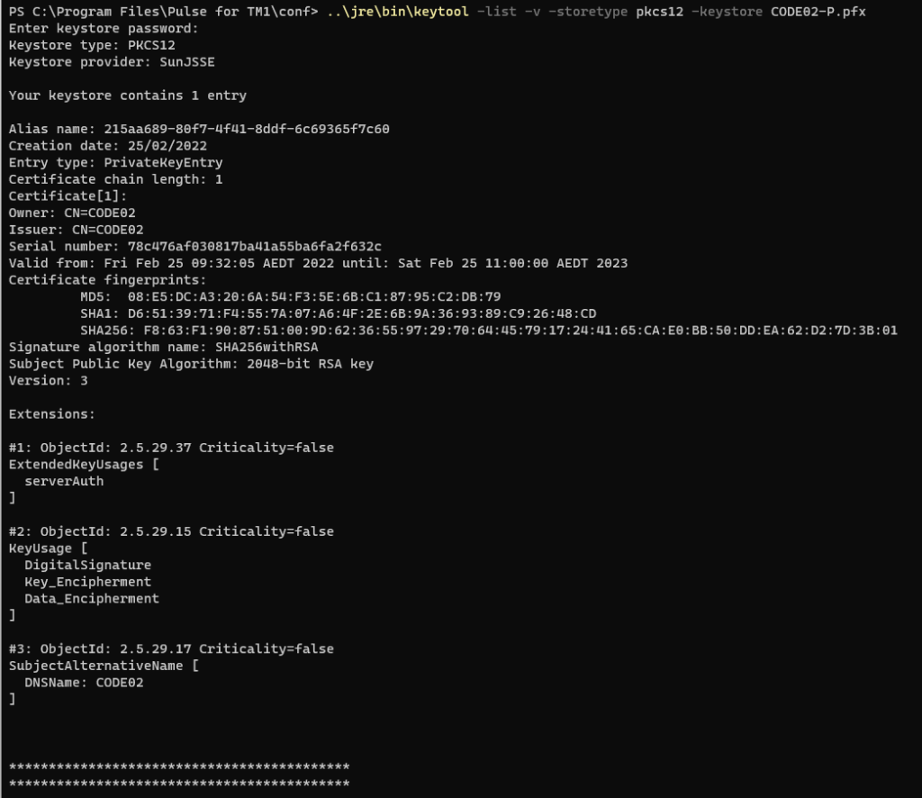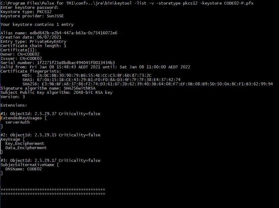..jrebinkeytool -list -v -storetype pkcs12 -keystore CODE02-P.pfx