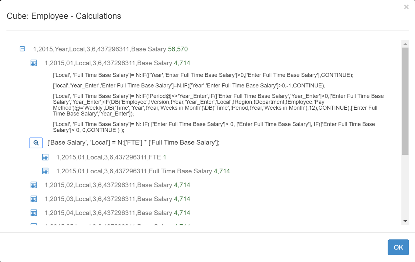 A new window will pop-up showing the intersection of the cell. If the intersection contains a consolidation, you will be able to drilldown until the leaf levels to find the rule: