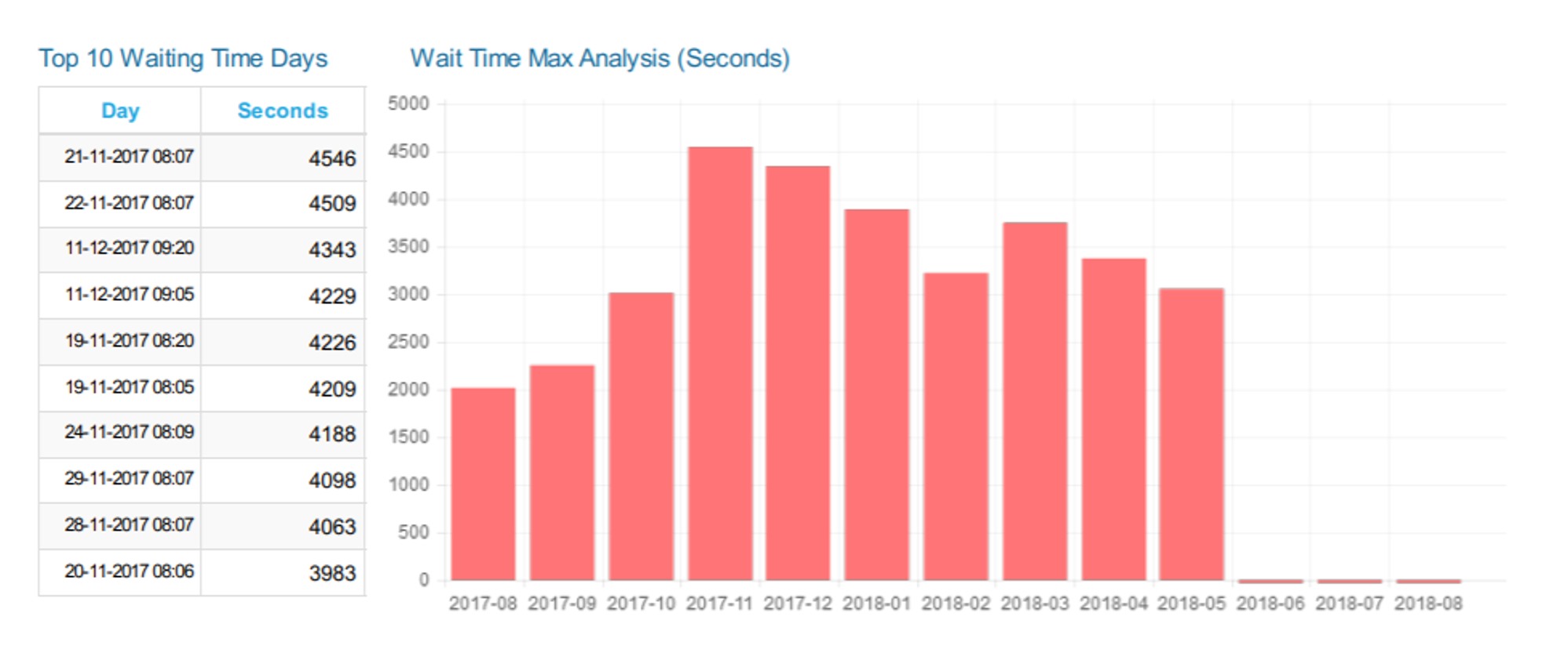 In the second section of the Report, administrators will see the Top 10 waiting time event, their duration, and a bar chart to analyse the maximum wait time by period.